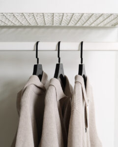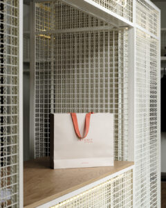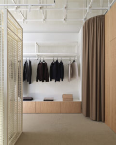 Il concept si sviluppa intorno a pochi elementi essenziali: una “scatola” neutra poggiata su un tappeto in fibra di lana, pannelli in rovere che definiscono pareti e contenitori, e un tessuto organico utilizzato per i camerini. Un elemento centrale in maglia metallica con contenitori in laminato e specchio introduce un tocco di contemporaneità, animando lo spazio con leggerezza.